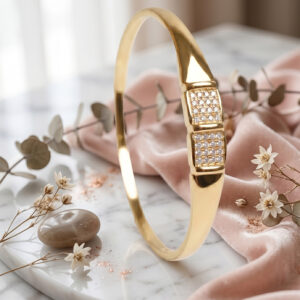 ₹700.00Original price was: ₹700.00.₹500.00Current price is: ₹500.00.A sleek and contemporary gold-toned bangle featuring a bold geometric center. Accented with two square pavé-set crystal "tiles," this structured bracelet blends minimalist lines with… -