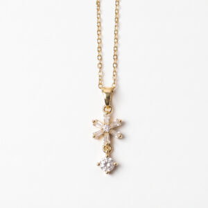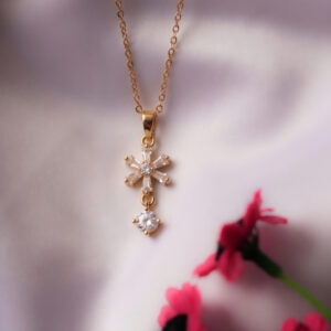 ₹700.00Original price was: ₹700.00.₹500.00Current price is: ₹500.00.Delicate gold chain necklace featuring a floral crystal design with a sparkling drop stone—perfect for minimal yet elegant styling. -
