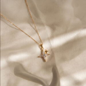 ₹700.00Original price was: ₹700.00.₹500.00Current price is: ₹500.00.Let your style shine with this 18K gold-toned celestial necklace. Featuring a striking North Star pendant adorned with baguette-cut crystals and a tiny companion star,… -