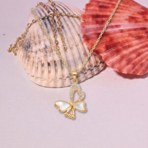 Gold Plated Mother of Pearl & Pavé Crystal Butterfly Pendant Necklace