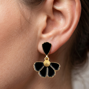 Black Enamel Floral Drop Earrings (Gold Tone)