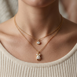 Gold Plated Double Layered Solitaire & Crystal Cluster Teddy Pendant Necklace