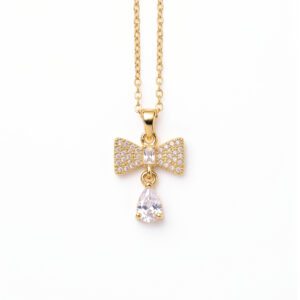 Golden Bow & Teardrop Crystal Pendant Necklace