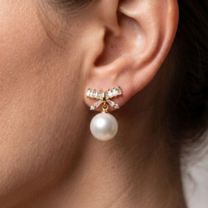 Gold Plated Bow Pearl Drop Earrings with Crystal Accent
