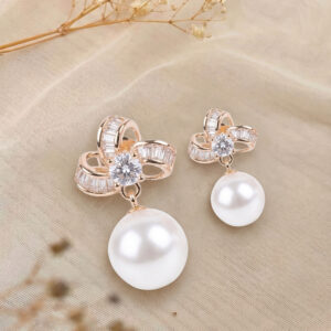 Gold Plated Bow Pearl Drop Earrings with Crystal Accent