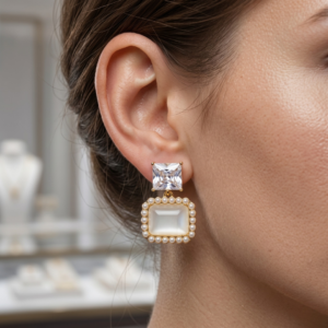 Geometric Crystal & Pearl Square Stud Earrings (Silver Tone)