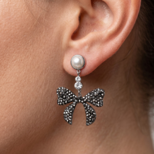 Black Crystal Bow Pearl Drop Earrings (Silver Tone)