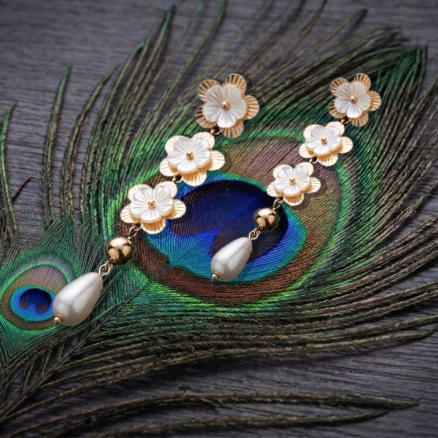 Gardenia Triple-Bloom Drop Earrings with Mother-of-Pearl Inlay & Teardrop Pearls