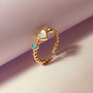 Mother of Pearl Heart & Turquoise Bezel Adjustable Gold Ring