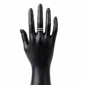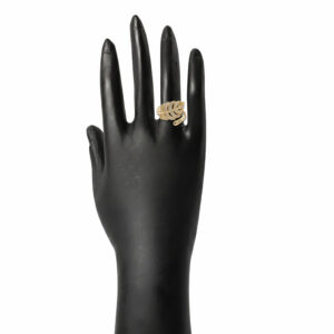 The open “cuff” or “bypass” silhouette not only adds a contemporary edge to the piece but also allows for slight adjustability, making it a comfortable choice for any finger. Whether worn as a bold statement piece or stacked with your favorite bands, this ring adds a sophisticated, tactile dimension to your jewelry collection.